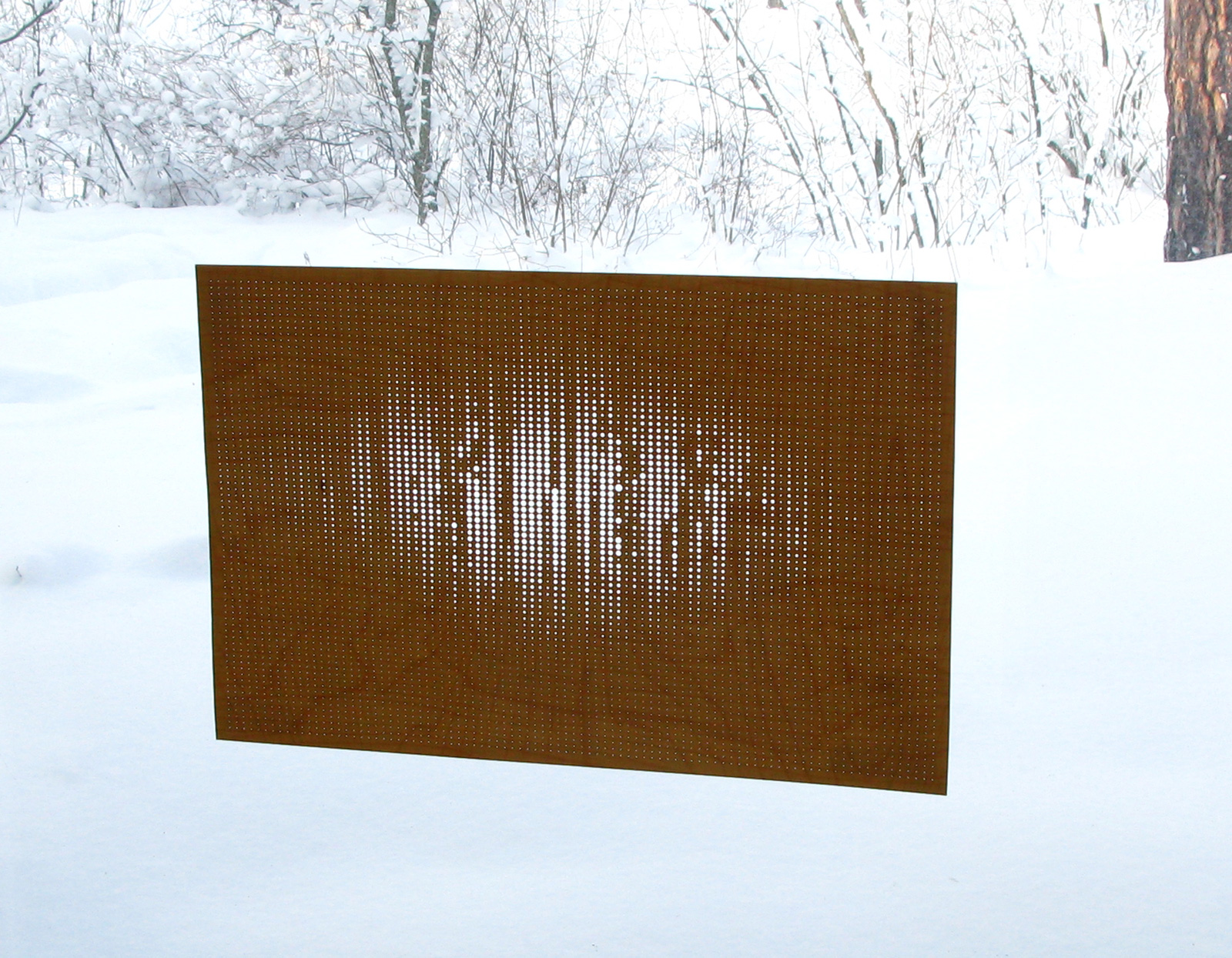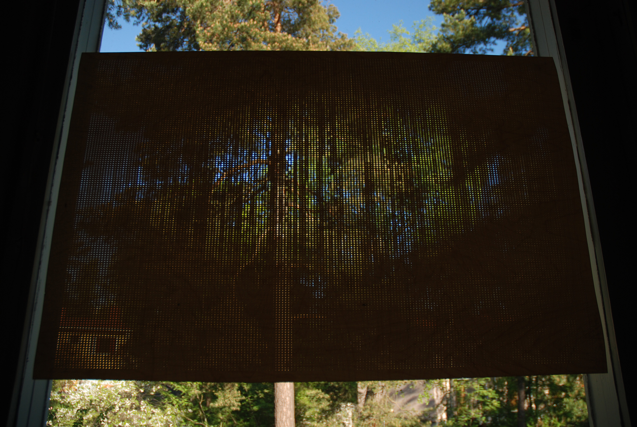 Besides recounting the year in sun and shade, the work investigates the relationship between what's being represented and the form of the representation. The representational elements, circles, allude to the sun's form, and the representation of light quantity is by the quantity of light the differently sized circles let through.